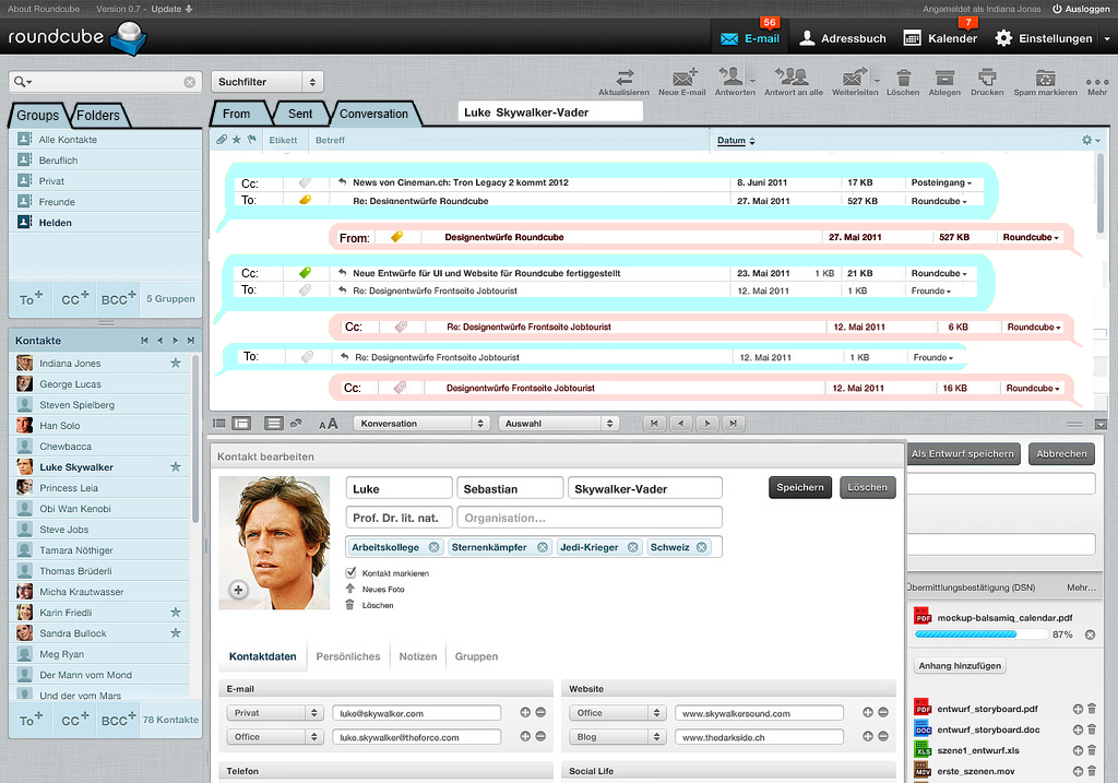 If the user keeps the 'folder view' in the left pane then the behaviour is the same as existing Roundcube, i.e. the list of emails appears in top pane and emails are previewed in the bottom pane. But clicking on a 'contact' gives the view in the screenshot above. It's a personal research experiment and partially implemented so far (the 'mail' view includes tabbed folders/contacts, and selecting a contact populates the 'preview' pane, but I haven't yet implemented the contact-centric view of the email list which I'm assuming should be possible using a pre-canned email search).